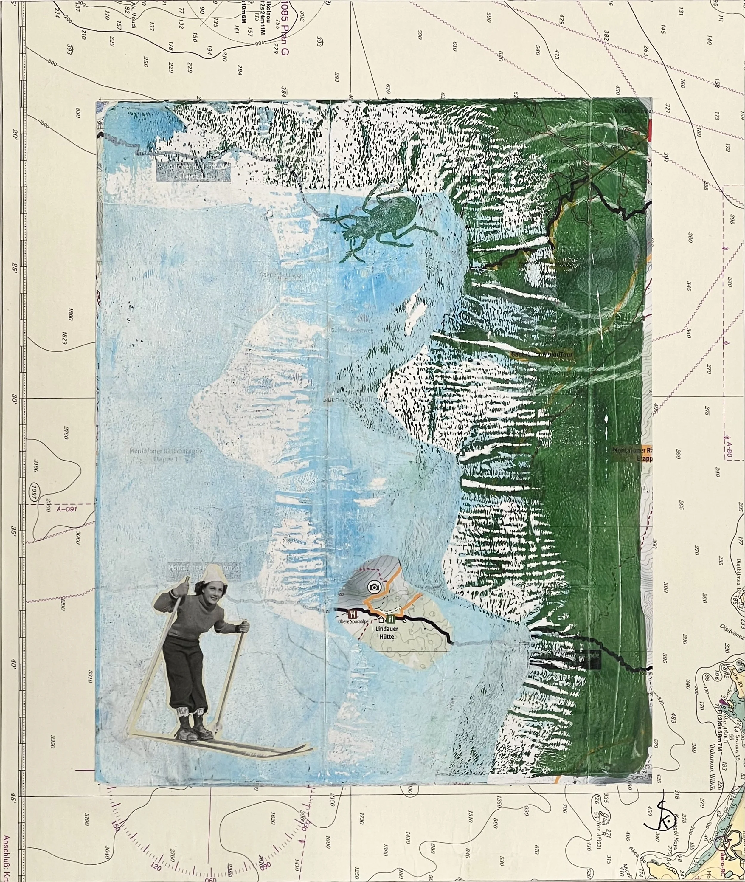 This monoprint is created through the layering of color and texture printed on geographical maps and mounted on authentic nautical maps.